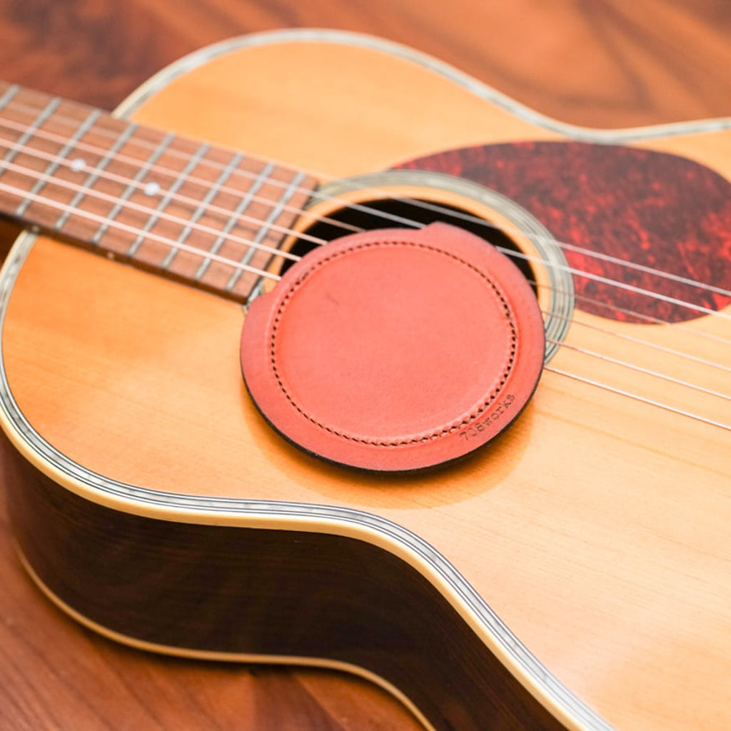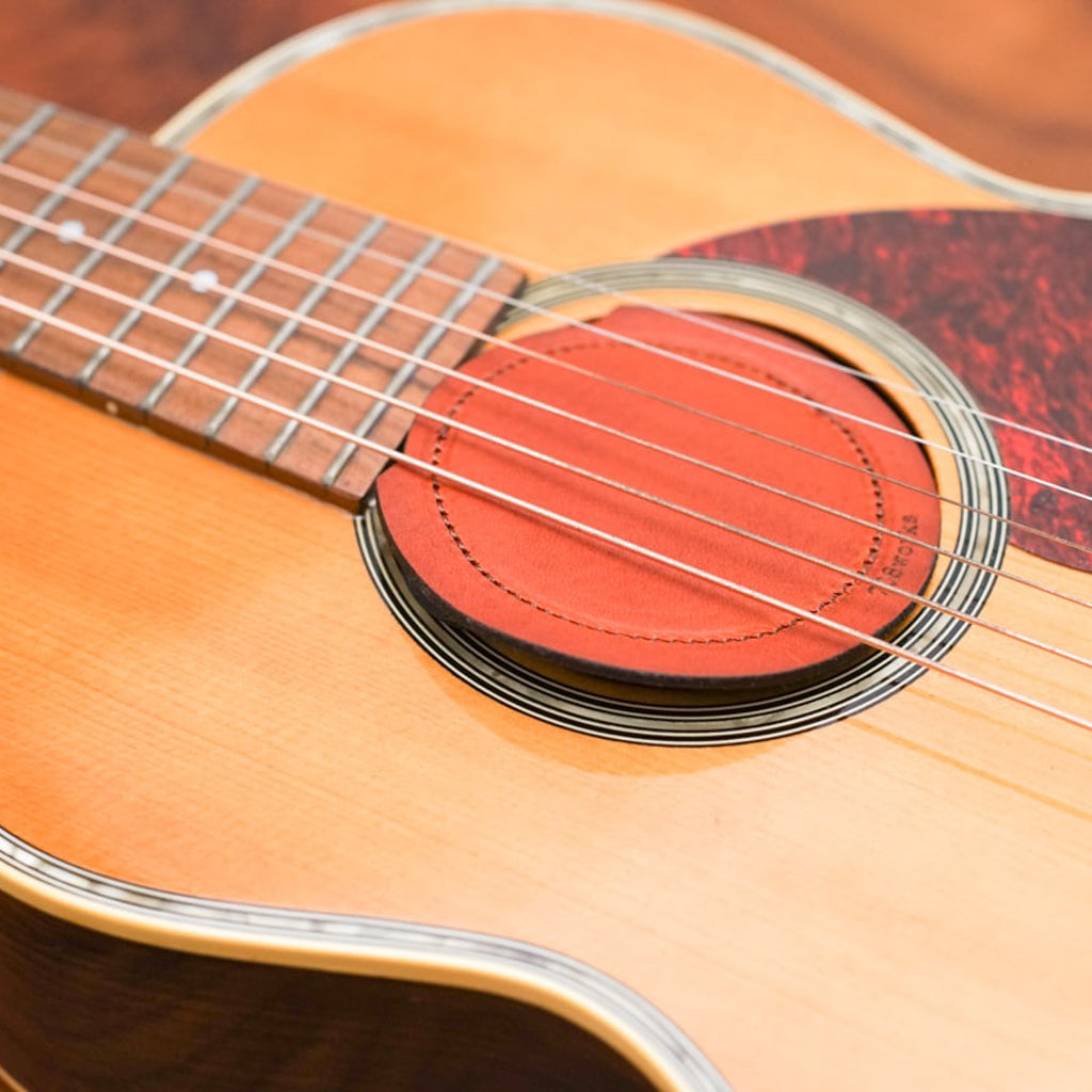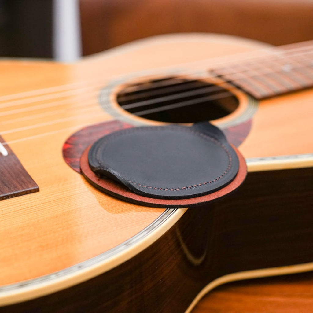 レザー(天然皮革)でアコースティックギター用のサウンドホールカバー(消音器)を作りました。音量を抑えることはもちろんのこと、フィードバックやハウリングを抑制する効果がある為、エレアコやエレガットをライブで使用する際に活躍します。 また、サウンドホールにホコリが入らないよう未然に防ぐことができます。