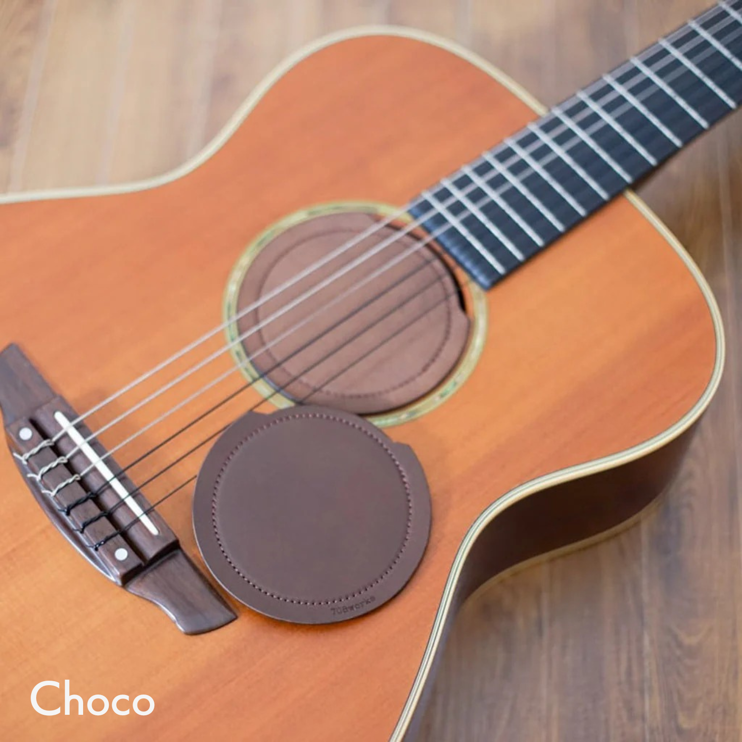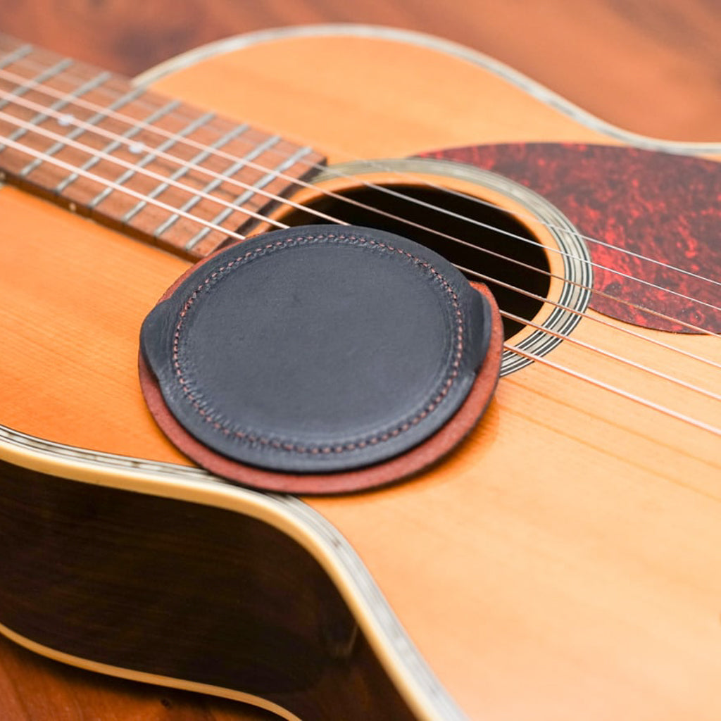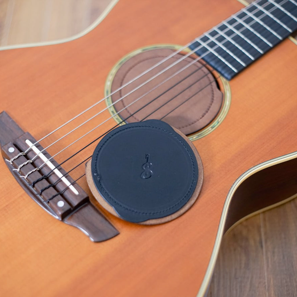 レザー(天然皮革)でアコースティックギター用のサウンドホールカバー(消音器)を作りました。音量を抑えることはもちろんのこと、フィードバックやハウリングを抑制する効果がある為、エレアコやエレガットをライブで使用する際に活躍します。 また、サウンドホールにホコリが入らないよう未然に防ぐことができます。