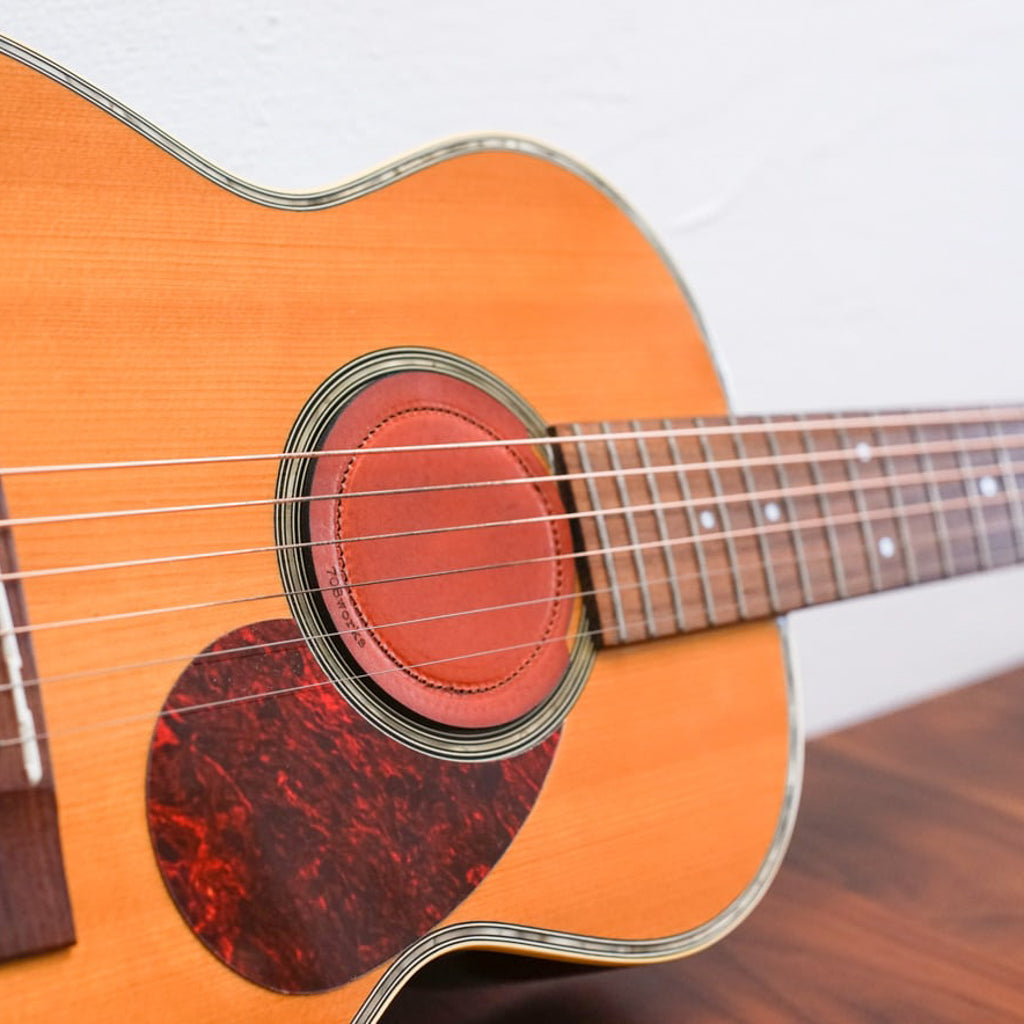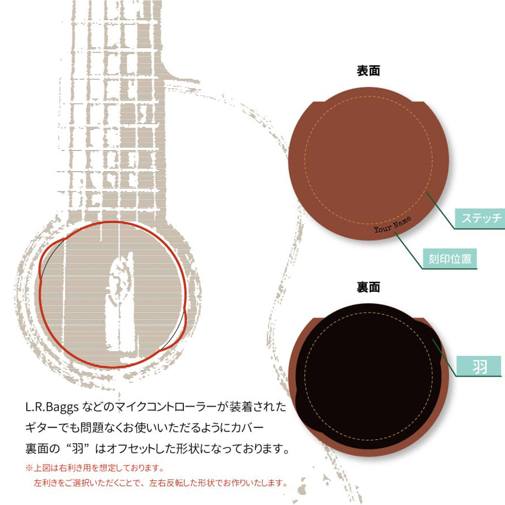 取り付け方法は簡単。 カバー裏面の”羽”部分を起こすように折り曲げ、サウンドホールに引っかけてからはめ込みます。革本来の柔軟性を活かした構造の為、楽器を傷つけることなく取り付け/取り外しが可能です。 一般的なフォークギターやクラシックギターなど、丸いサウンドホールのギターにお使いいただけます。名入れ刻印もできますので、プレゼントにも最適です! ※※ご注意ください※※ サウンドホールの形状が円形の楽器のみ装着できます。特殊形状(三角形、星形など)には対応しておりません。また、Fender ACOUSTASONIC(アコースタソニック)など特殊な構造の楽器には対応しておりません。